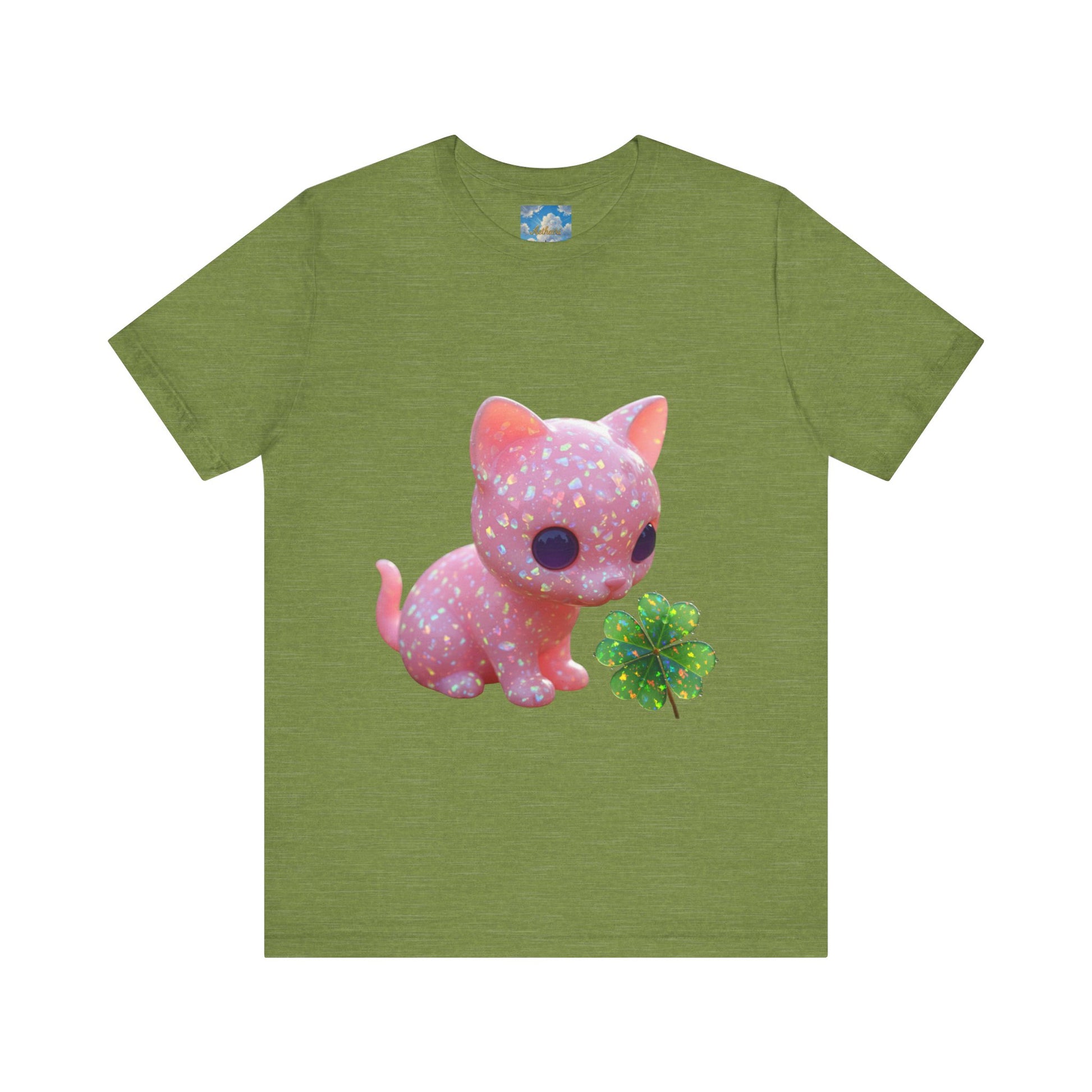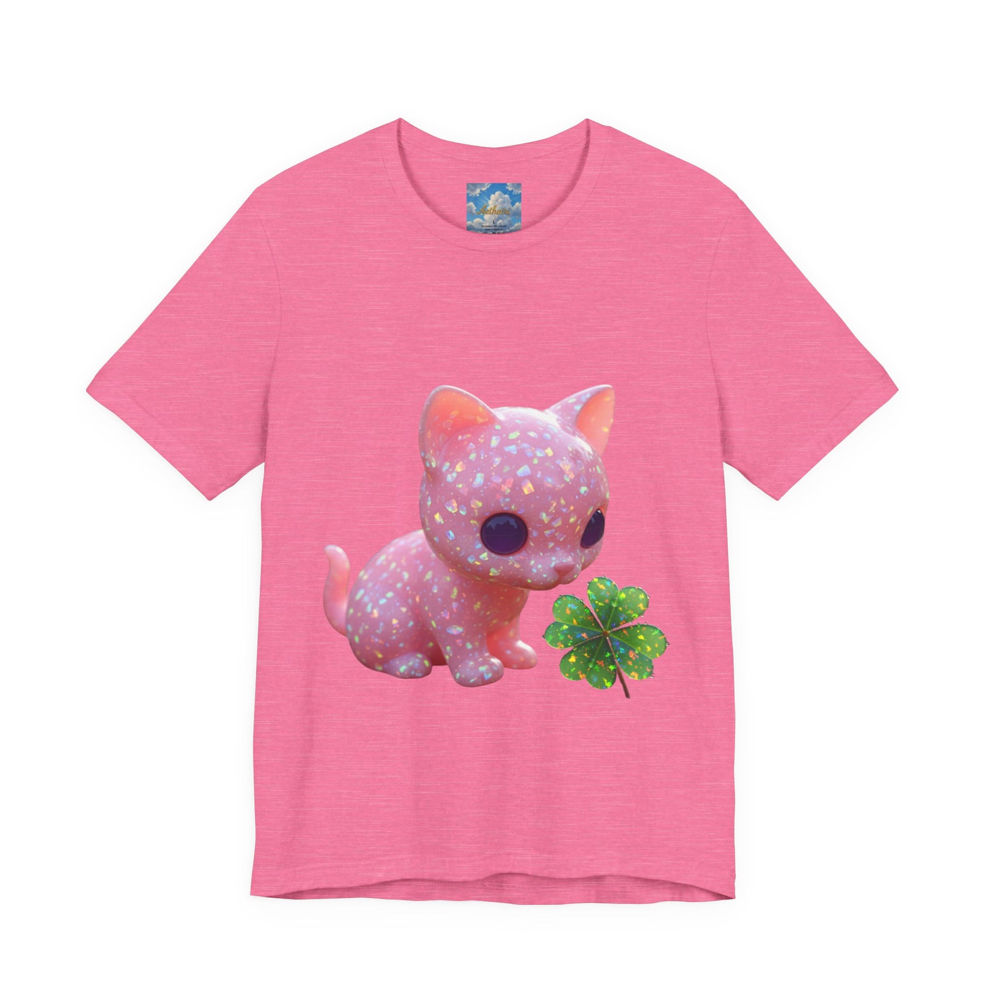 This lightweight crew-neck tee brings a playful, lucky-charm energy to everyday wear. A small, sparkly pink kitten with oversized eyes sits beside a four-leaf clover on a soft pink backdrop, giving the shirt a whimsical, collectible-vibe that reads both nostalgic and modern. The retail fit and breathable Airlume combed cotton make it easy to layer under a jacket or wear on its own for a relaxed, put-together look. Subtle details like a ribbed collar, shoulder tape and side seams keep the shape crisp after many washes. Wear it when you want a touch of charm — whether wandering a weekend market, sharing coffee with friends, or adding a pop of color to your daily routine.