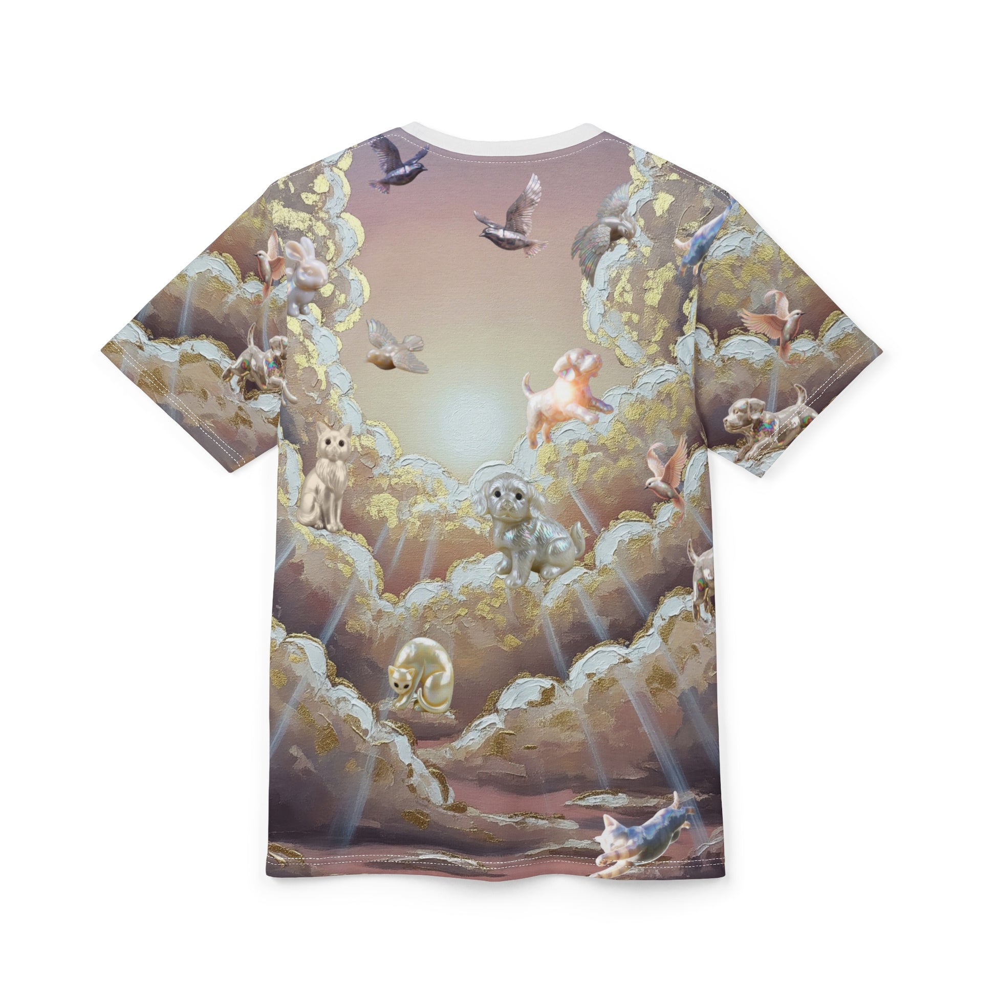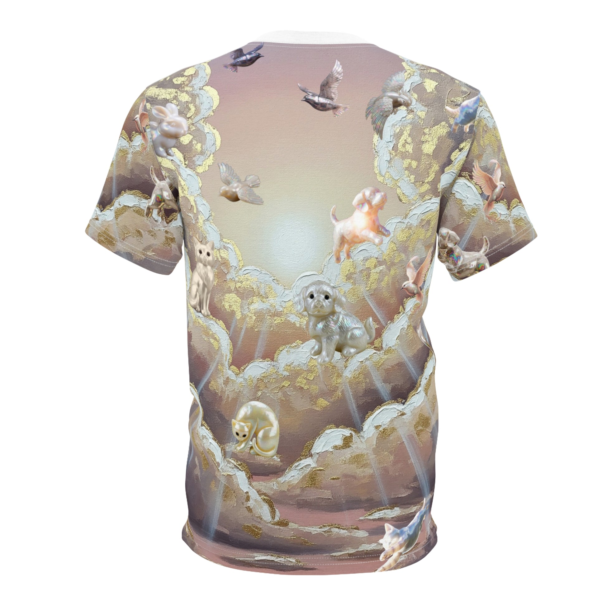 Mother of Pearl Kitties and Puppies in Paradise, Champagne Colored Sunset Unisex Tee, Wedding Honeymoon Tee, Cute Animal Print T-Shirt, Casual Top, Gift for Pet Lovers, Dreamy Nature Shirt
