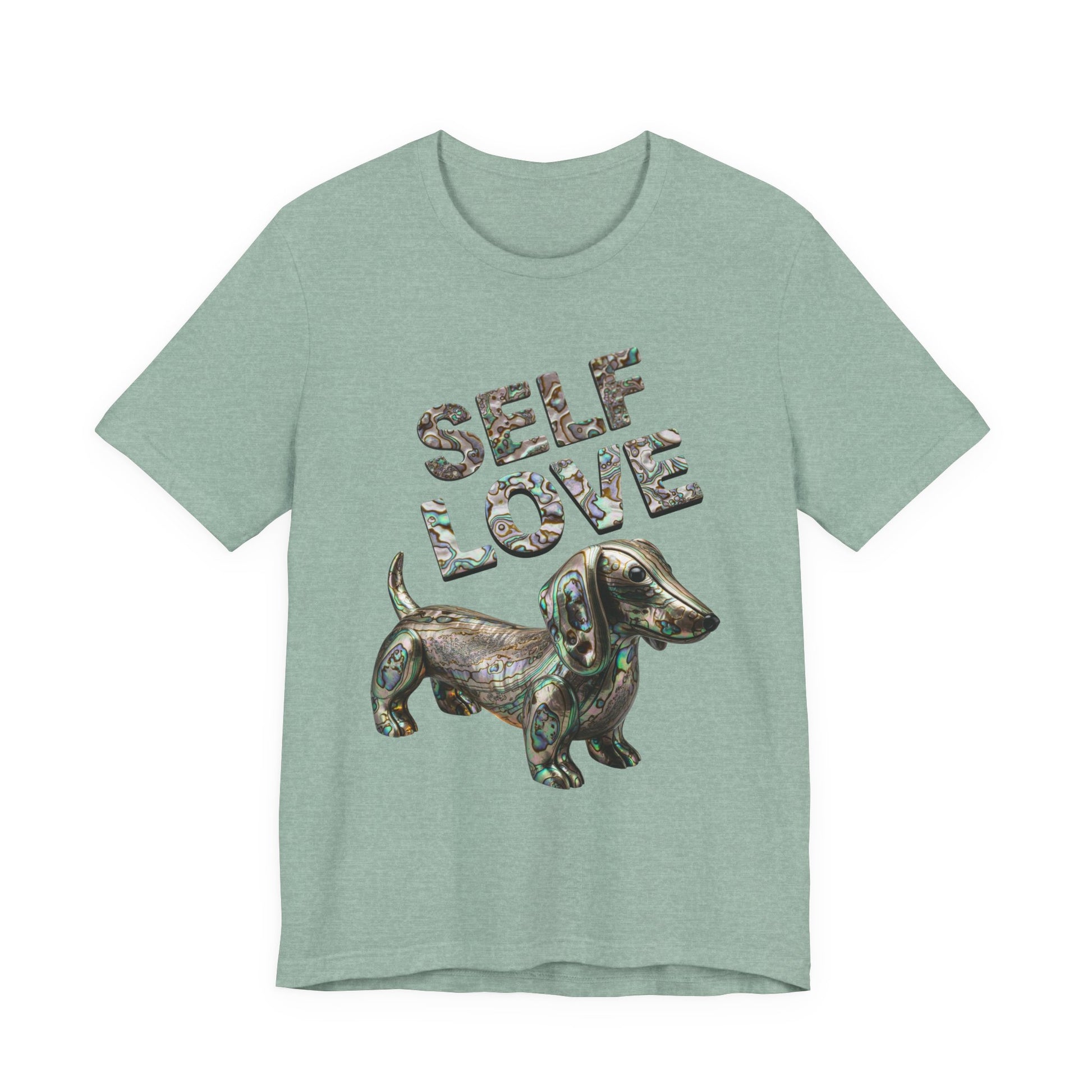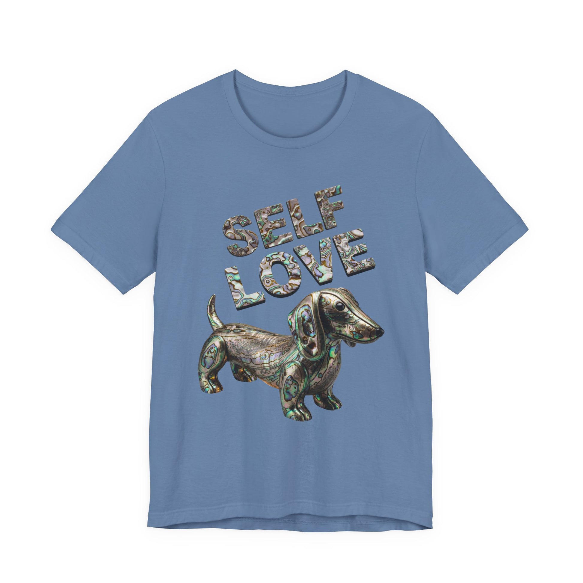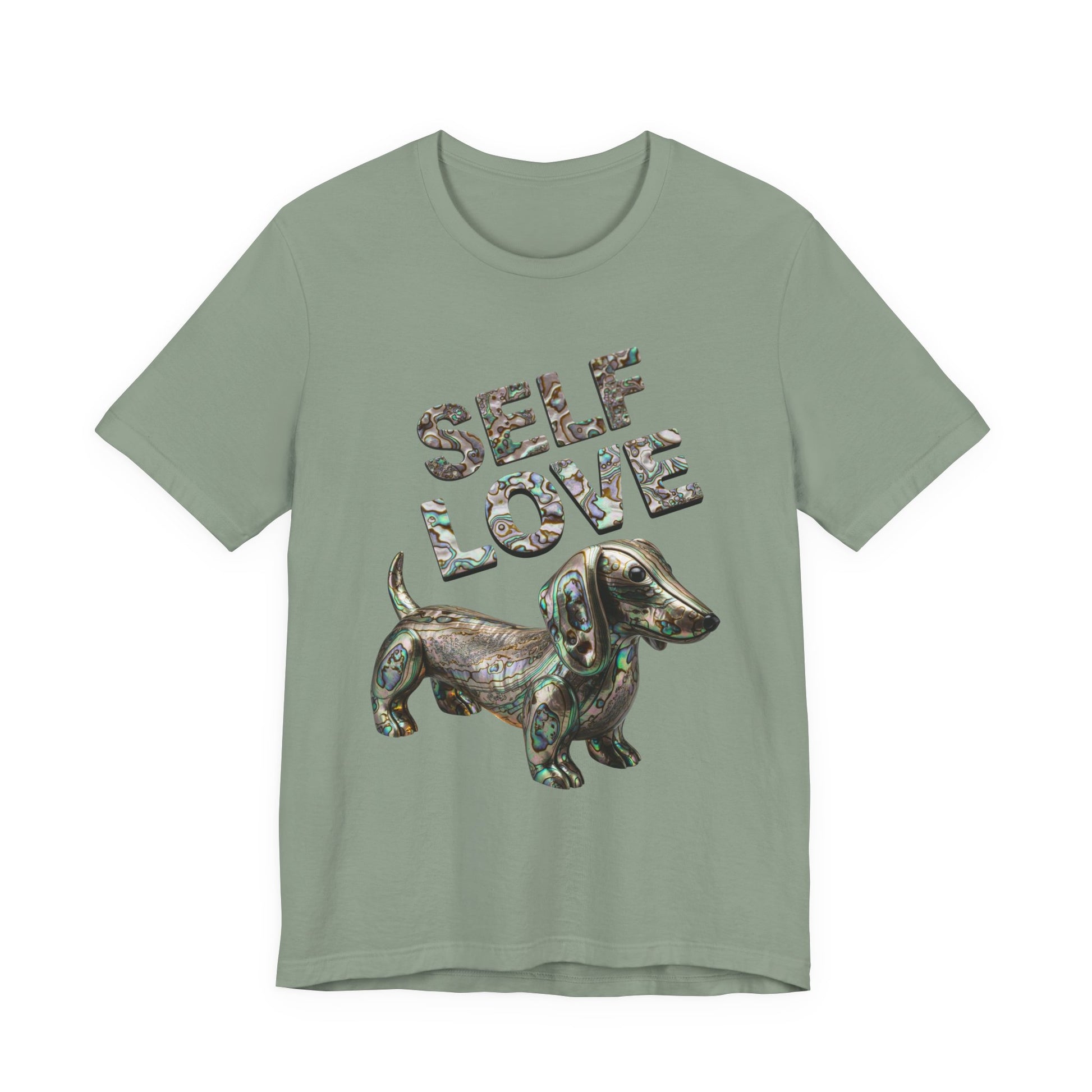 Embrace your own uniqeness with a gorgeous Self Love t-shirt featuring a weiner dog made out of Abalone just as unique as you are! This self love tee is sure to be a unique statement piece to add to your wardrobe. This lightweight and breathable tee is crafted from 100% Airlume combed and ring-spun cotton, perfect for layering or wearing solo. The playful design features "SELF LOVE" in a vibrant Abalone letters, making it a fantastic addition to add a little luxery to your everyday wardrobe. Ideal for expressing positivity and self-affirmation, this tee is suitable for anyone who values comfort and self-expression in their attire. Whether you're lounging at home, running errands, or meeting friends, this shirt is the perfect choice. Celebrate special moments like birthdays, self-care days, or simply treat yourself. It’s not just a shirt; it’s a statement!