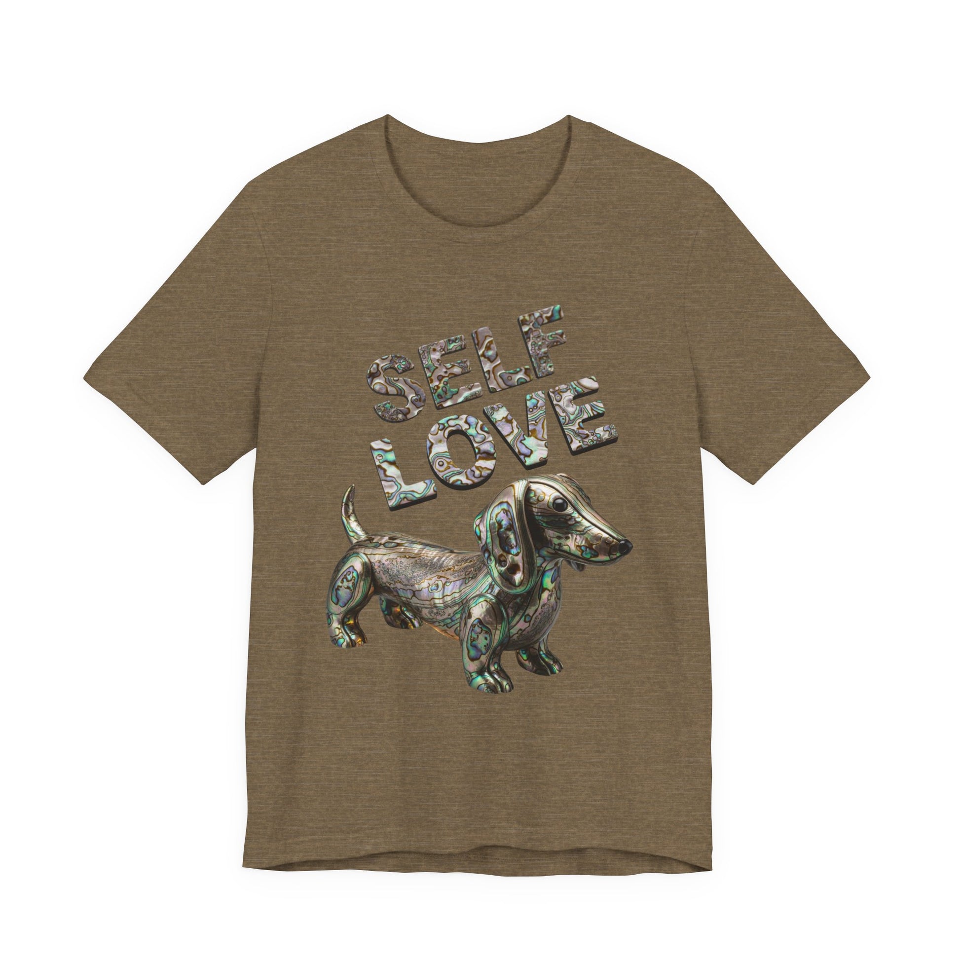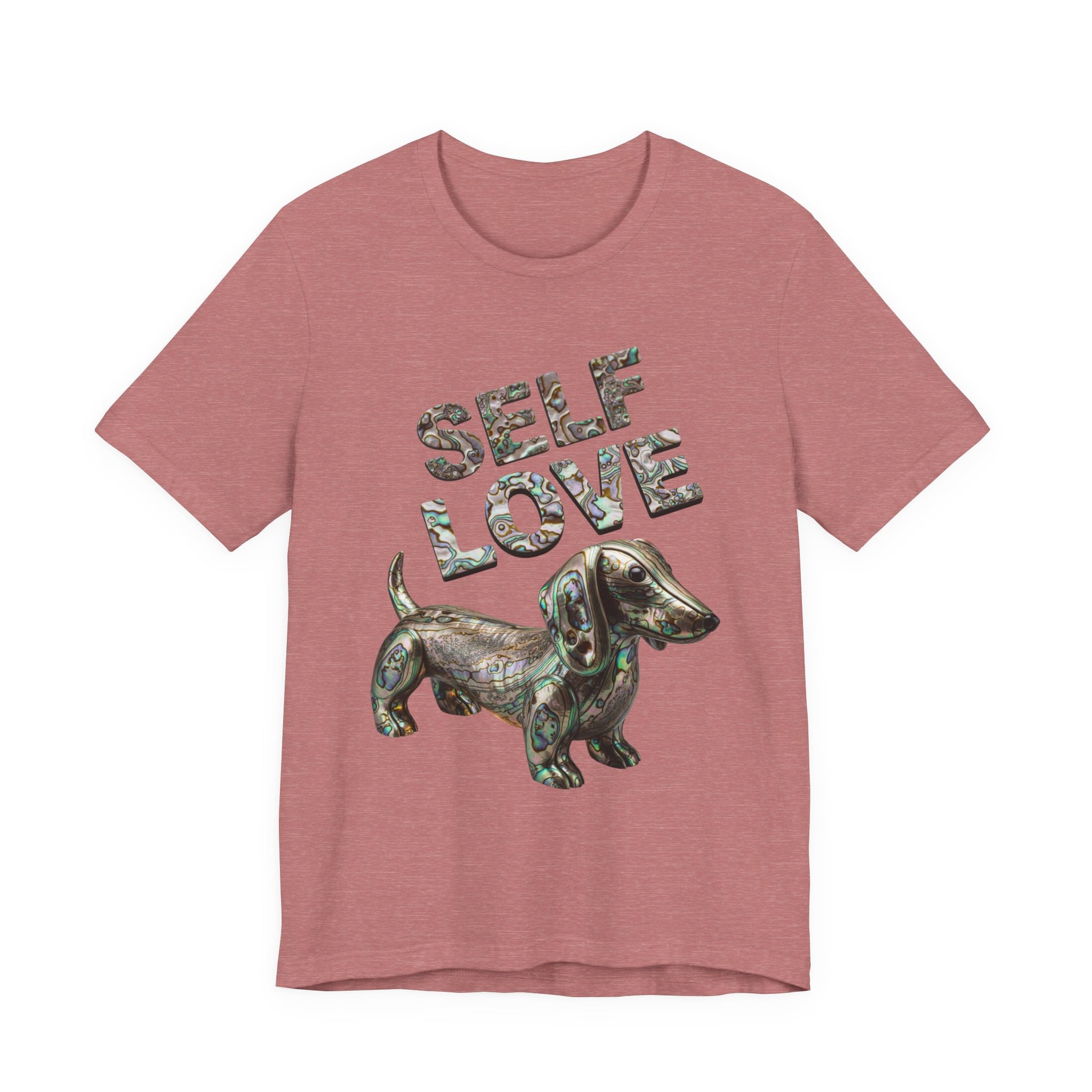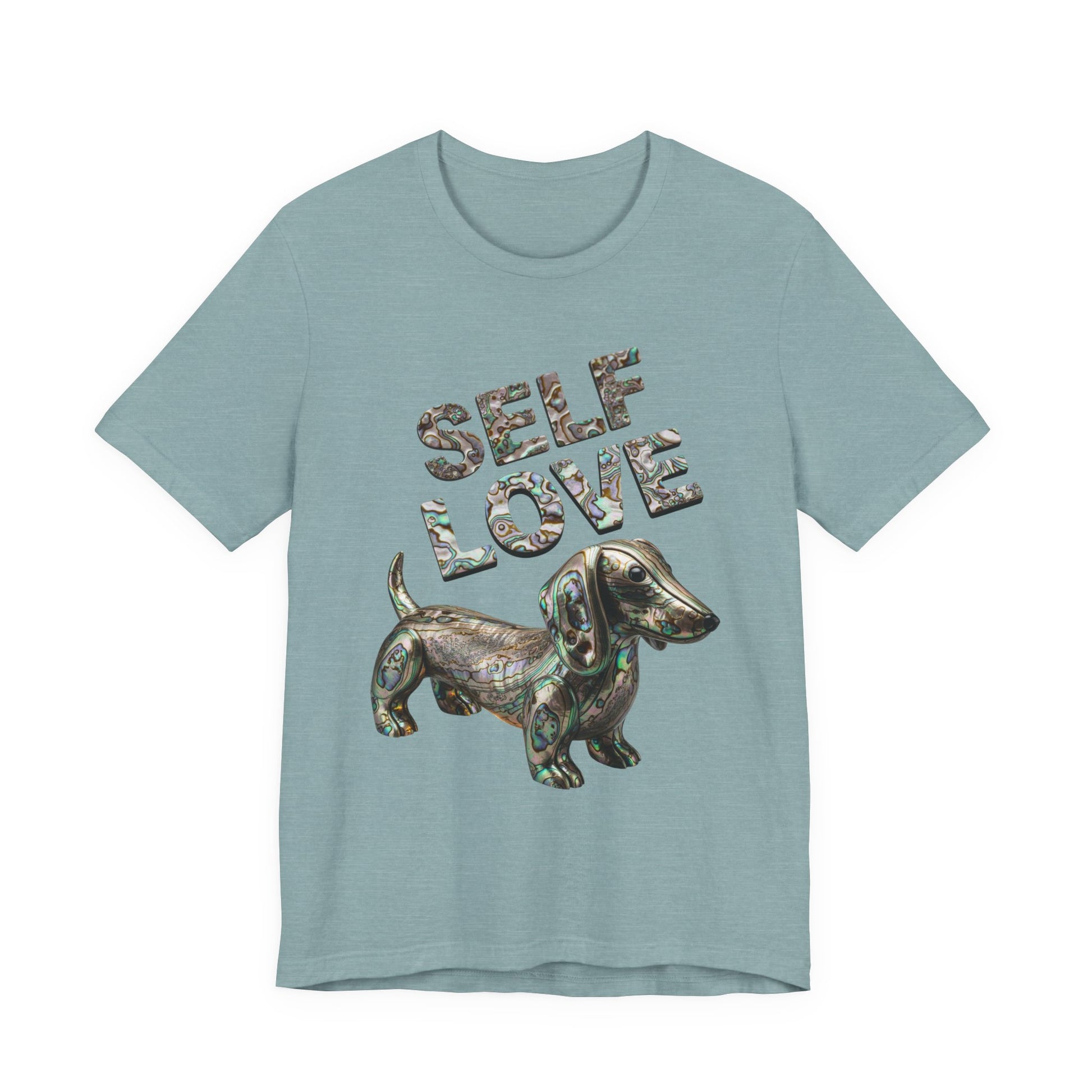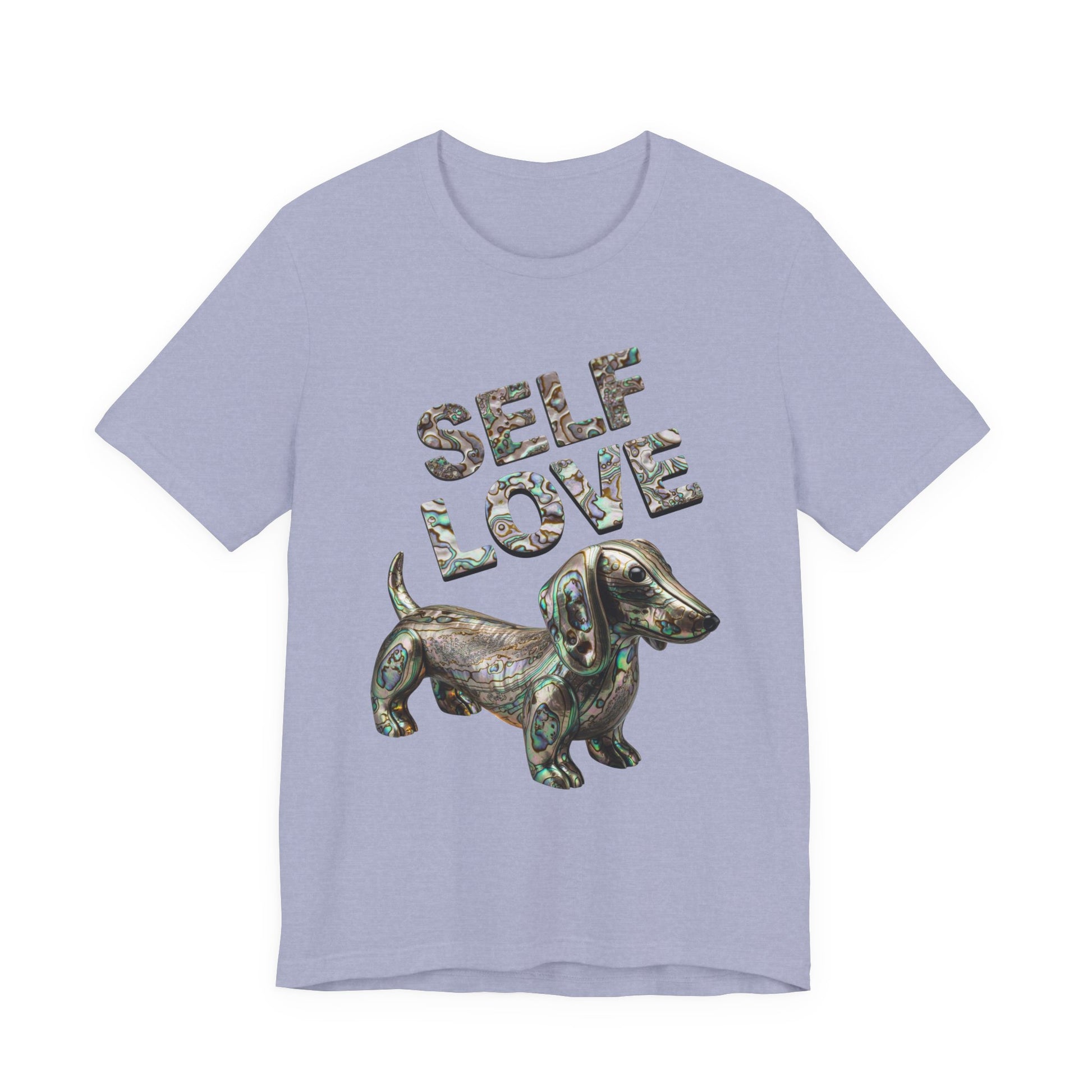 Embrace your own uniqeness with a gorgeous Self Love t-shirt featuring a weiner dog made out of Abalone just as unique as you are! This self love tee is sure to be a unique statement piece to add to your wardrobe. This lightweight and breathable tee is crafted from 100% Airlume combed and ring-spun cotton, perfect for layering or wearing solo. The playful design features "SELF LOVE" in a vibrant Abalone letters, making it a fantastic addition to add a little luxery to your everyday wardrobe. Ideal for expressing positivity and self-affirmation, this tee is suitable for anyone who values comfort and self-expression in their attire. Whether you're lounging at home, running errands, or meeting friends, this shirt is the perfect choice. Celebrate special moments like birthdays, self-care days, or simply treat yourself. It’s not just a shirt; it’s a statement!
