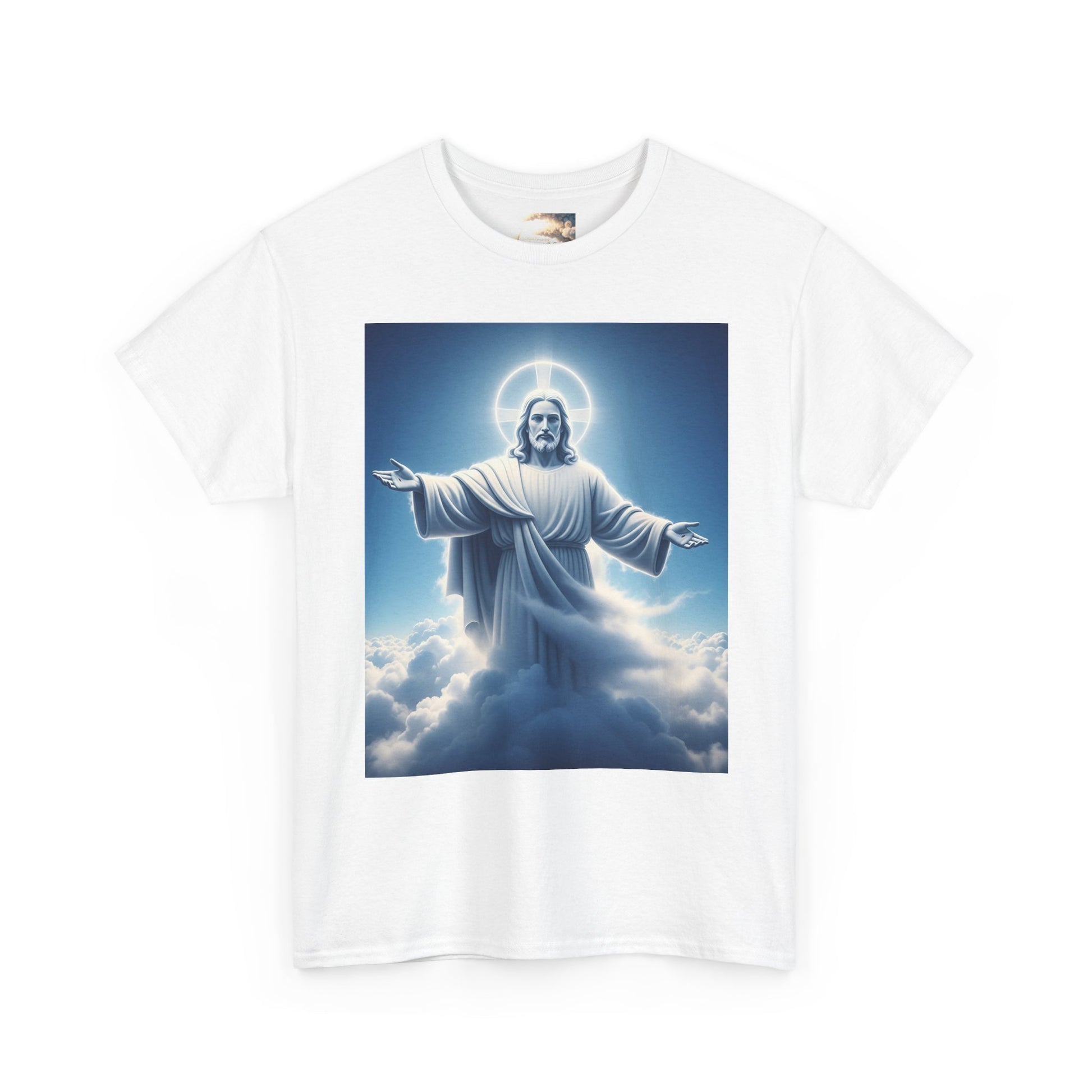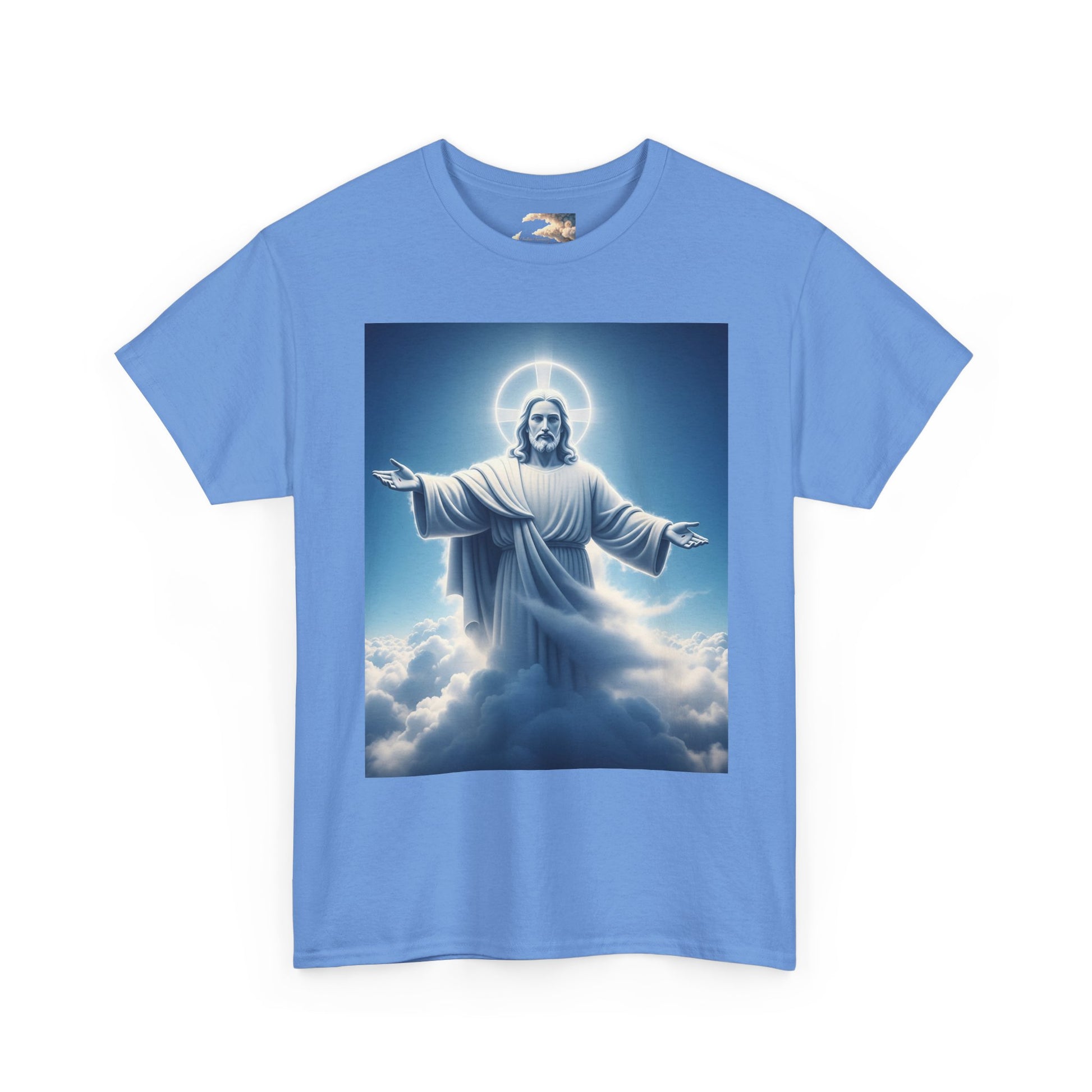 This picture of heavenly Jesus sculpted out of clouds adds whimsy and reverence to your style. The unisex heavy cotton tee is the basic staple of any wardrobe. It is the foundation upon which casual fashion grows. All it needs is a personalized design to elevate things to profitability. The specially spun fibers provide a smooth surface for premium printing vividity and sharpness. No side seams mean there are no itchy interruptions under the arms. The shoulders have tape for improved durability.